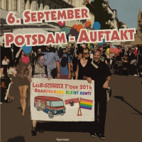 Zum 15. Mal in 16 Jahren geht die LesBiSchwule T*our am 6. September 2014 an den Start um in großen und kleinen Städten des Landes Brandenburg, in Jugendclubs, Schulen, Bibliotheken, Beratungsstellen, auf Marktplätzen und in Diskussionsrunden, Filmvorführungen, Lesungen, Workshops und Fortbildungen für einen respektvollen und wertschätzenden Umgang aller Menschen zu werben.
